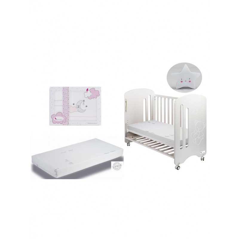 Pack para cuna en la que incluimos todo lo que necesitas para que el bebé descanse, cunita, colchón, un juego de sábanas y de regalo una lámparita quitamiedo.
